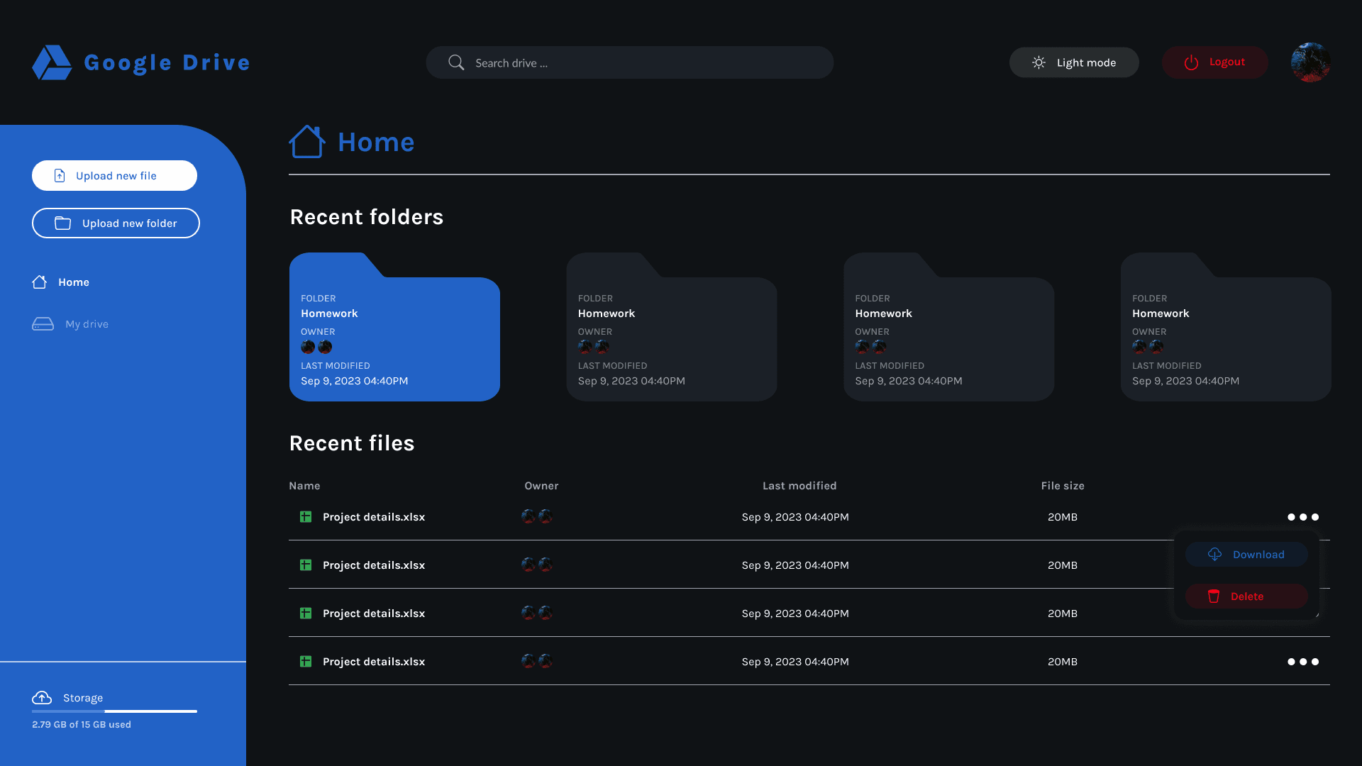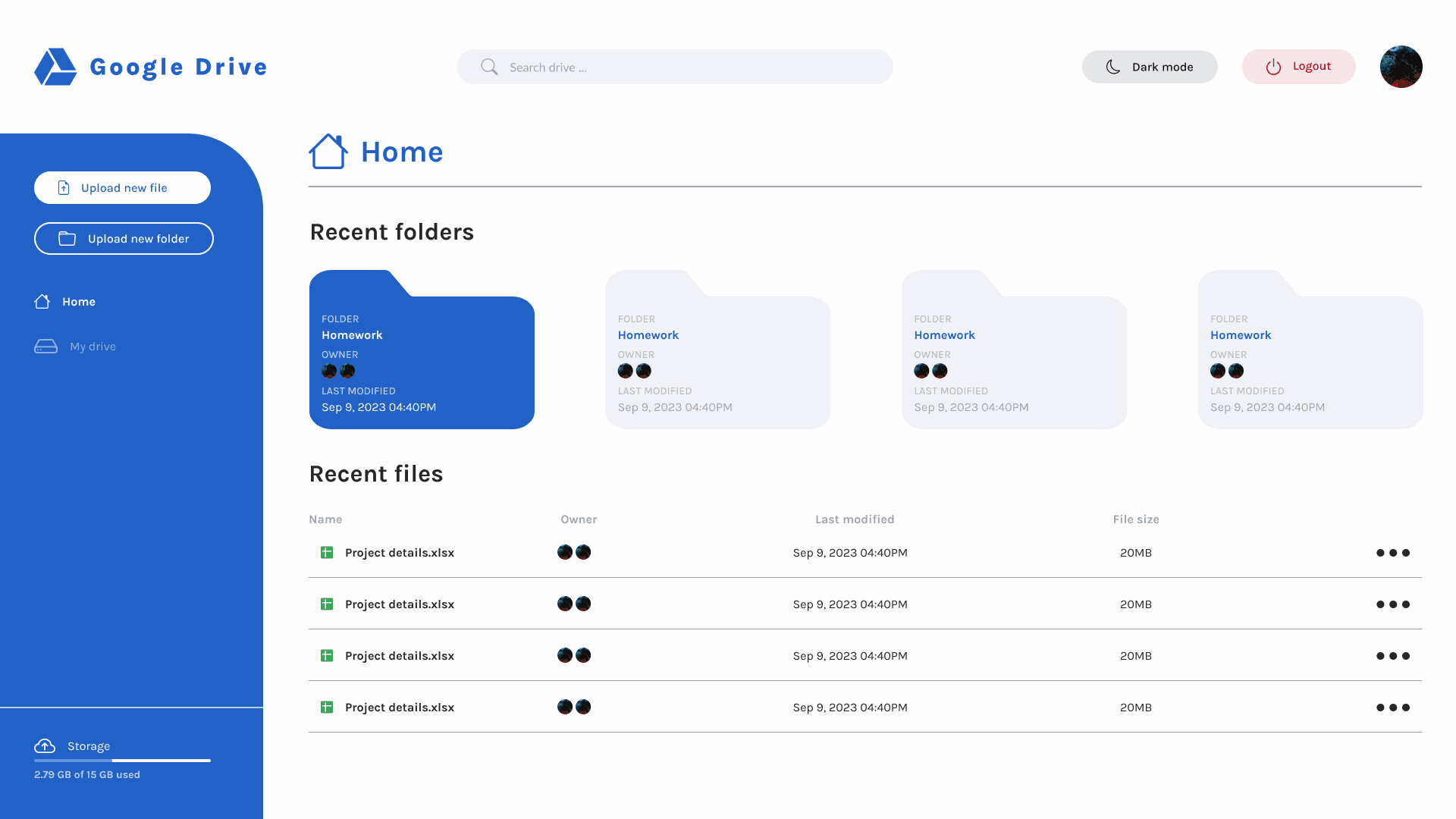 I created a frontend client for the Google Drive API to make managing files and folders more intuitive and user-friendly. This application supports secure login with OAuth 2.0, drag-and-drop uploads, and simple folder creation. It also includes a fast search feature, easy folder navigation, and the ability to delete files and folders efficiently.